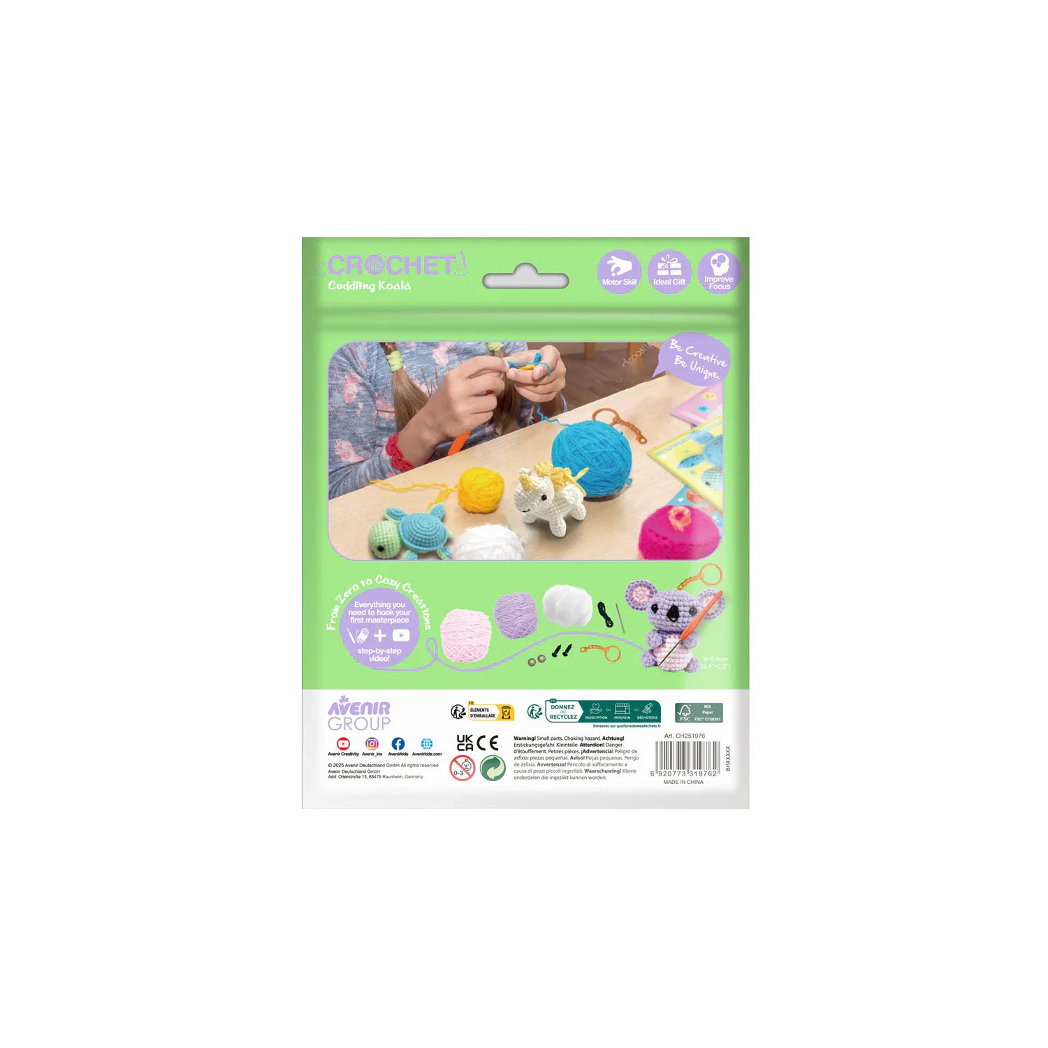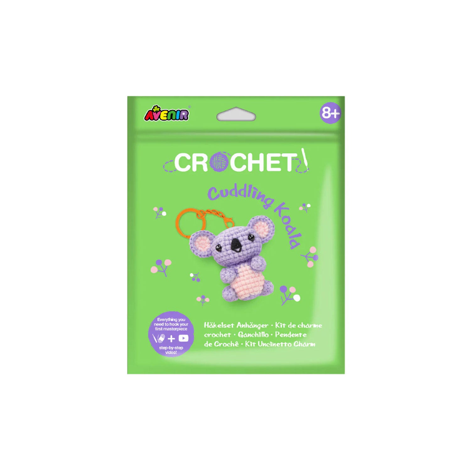 A: Everything a little crafter needs is in the kit: pre-cut yarn in koala grey, a child-friendly crochet hook, safety eyes, stuffing, a keychain clip, and easy-to-follow illustrated instructions. No trips to the craft store needed.
