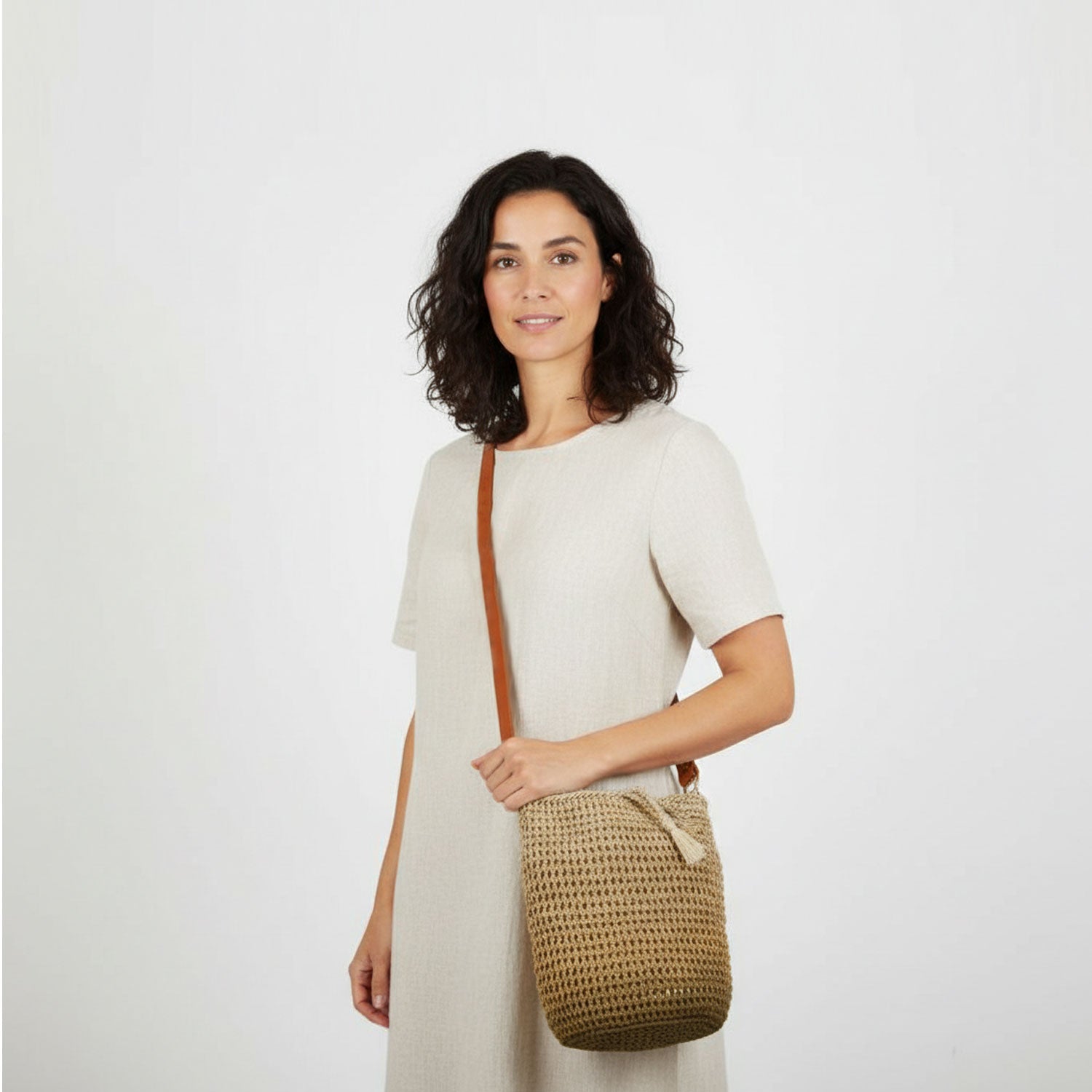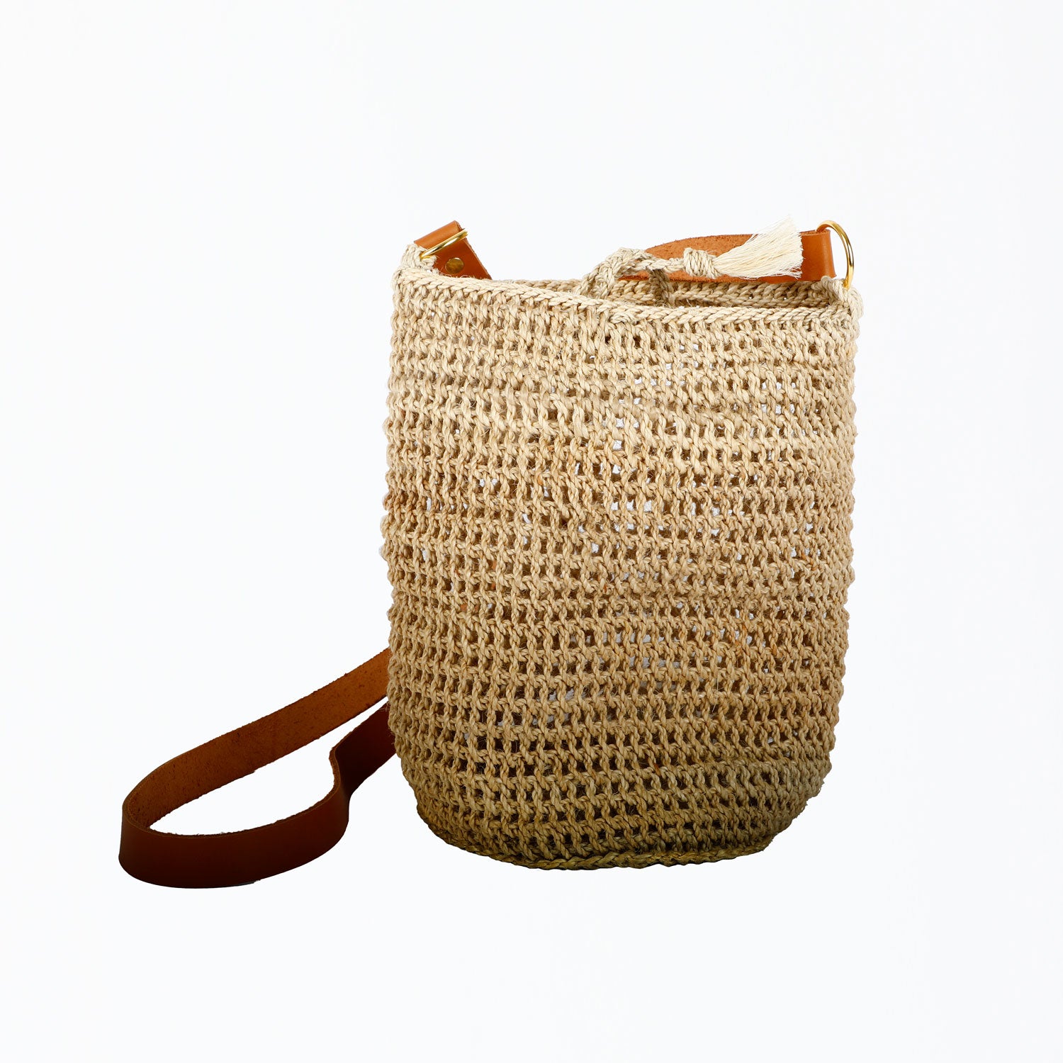 This bucket-style bilum features a characteristic round base and stands upright, making it practical for everyday use. It is finished with a cross-body leather strap and solid brass rings, available in brown or tan leather. The bag measures 26cm in height with an 18cm diameter base. The 120cm leather strap provides a 60cm drop when worn.