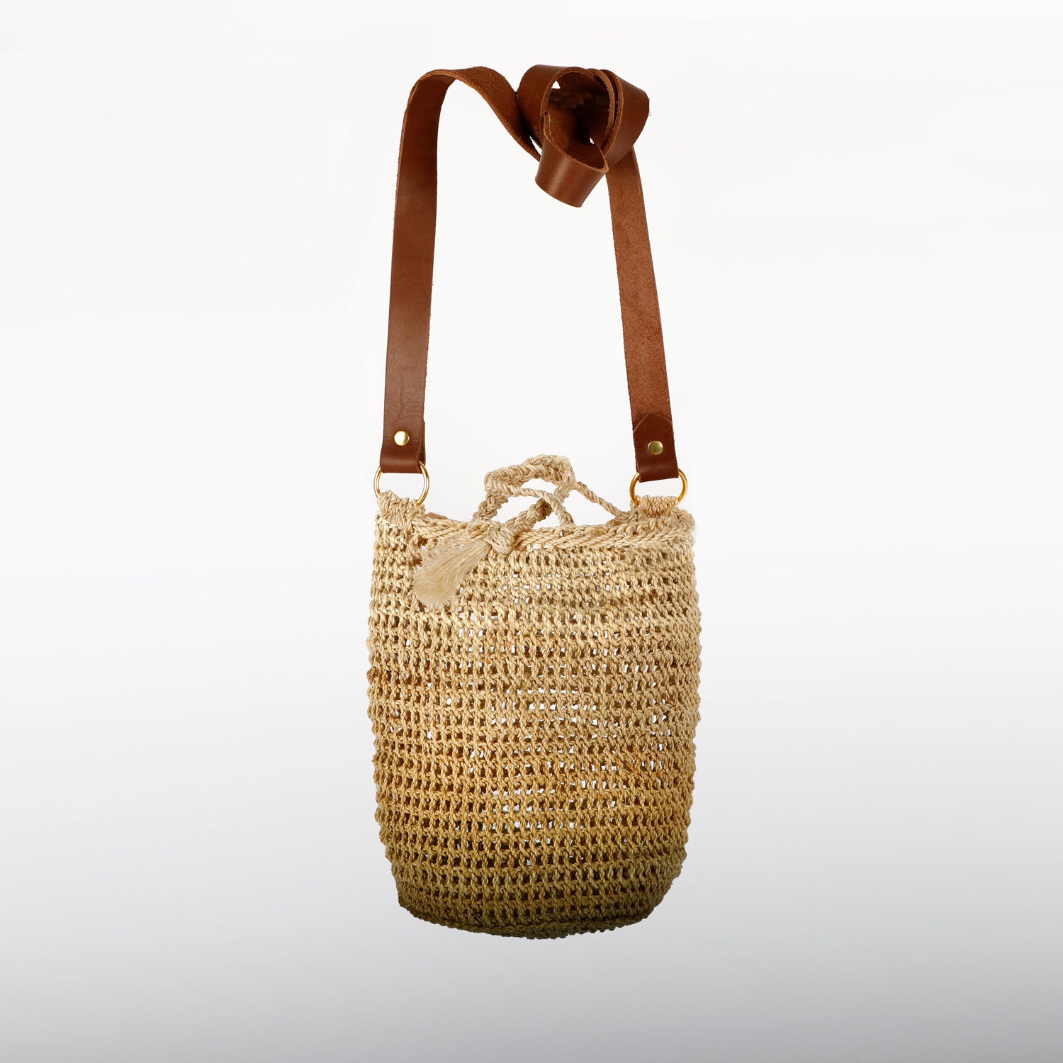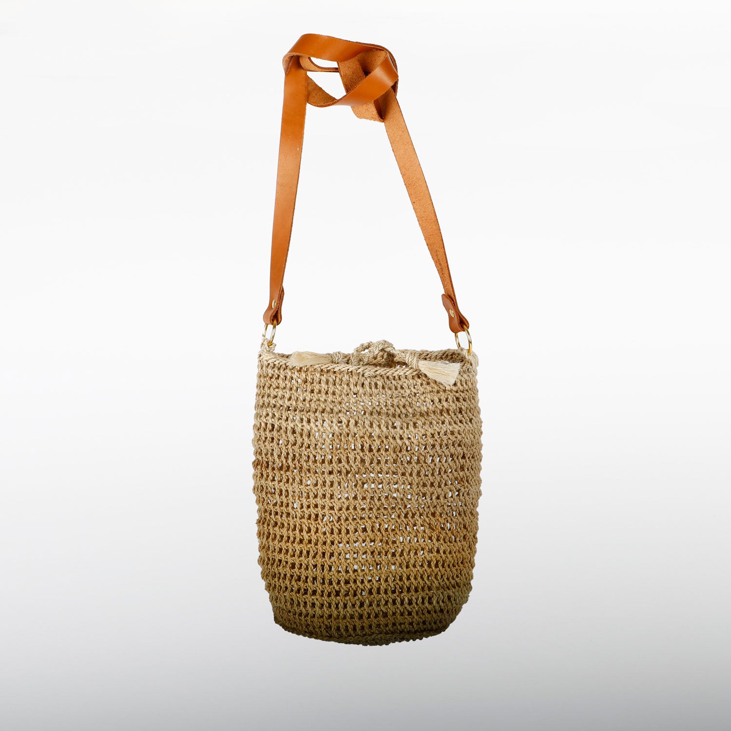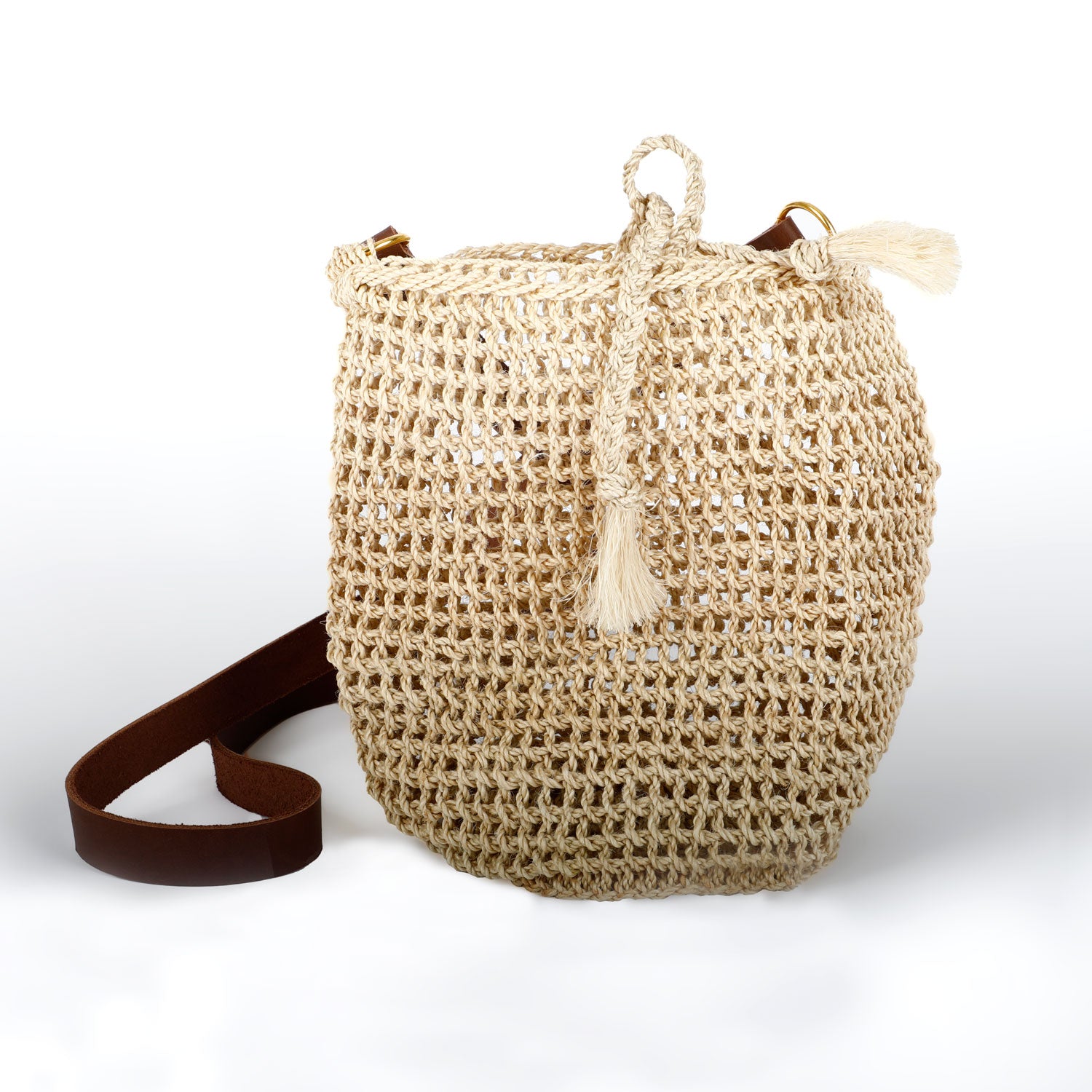 Handwoven Papuan Bilum | Leather strap natural string bucket bag