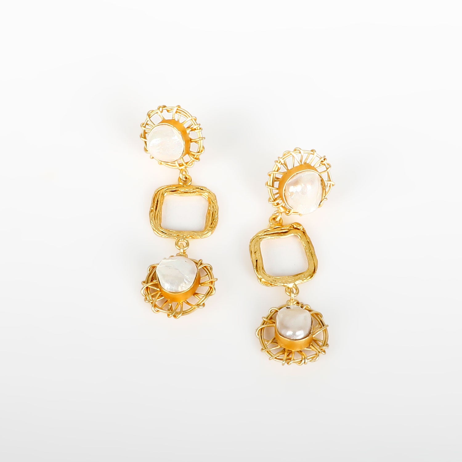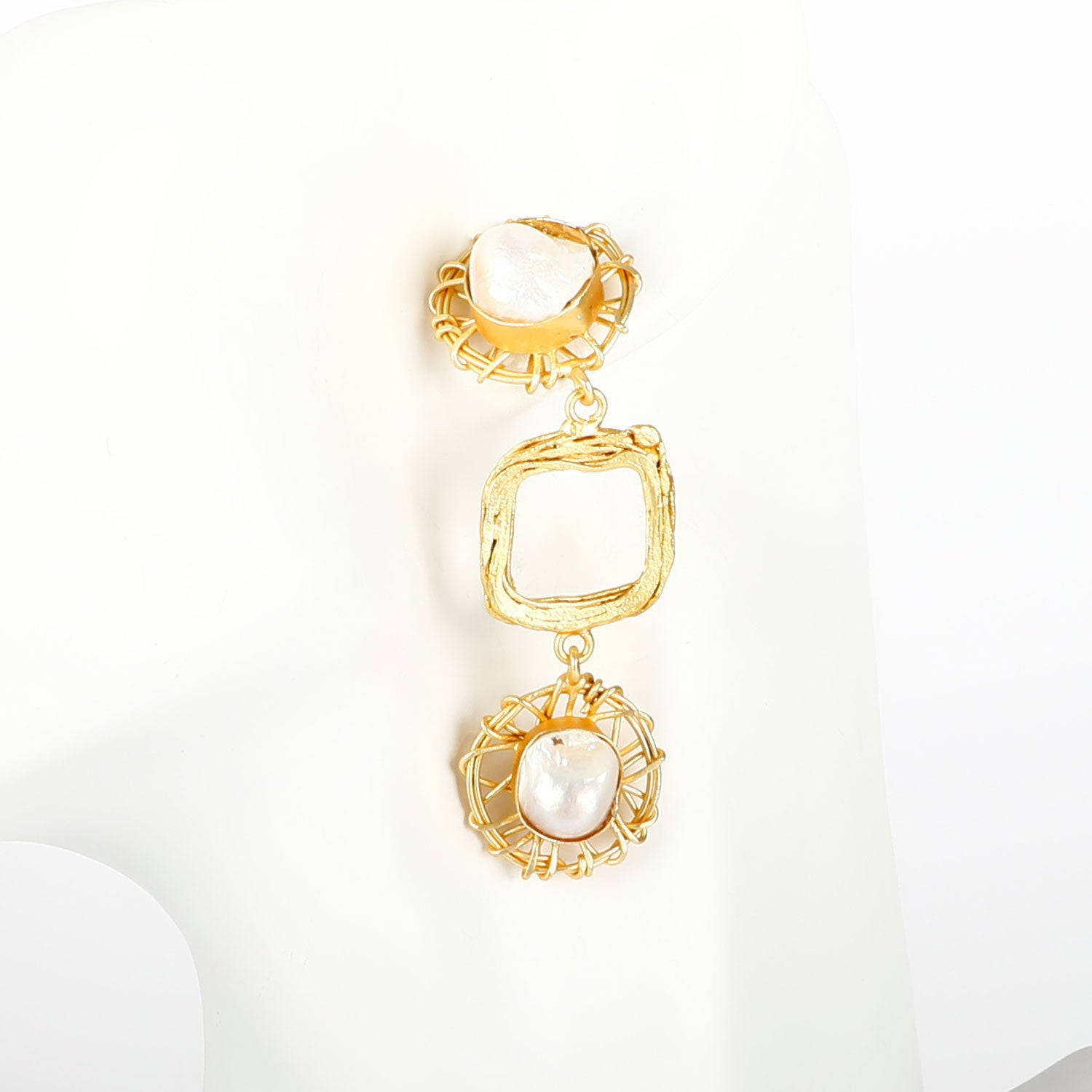 With a generous 72 mm drop length, the elongated, sculptural form creates movement and visual impact. The contrast between the clean geometry of the gold wire squares and the softness of the pearl detailing gives the earrings a contemporary, art-driven aesthetic. The open wire construction keeps the design light while remaining bold and expressive.
