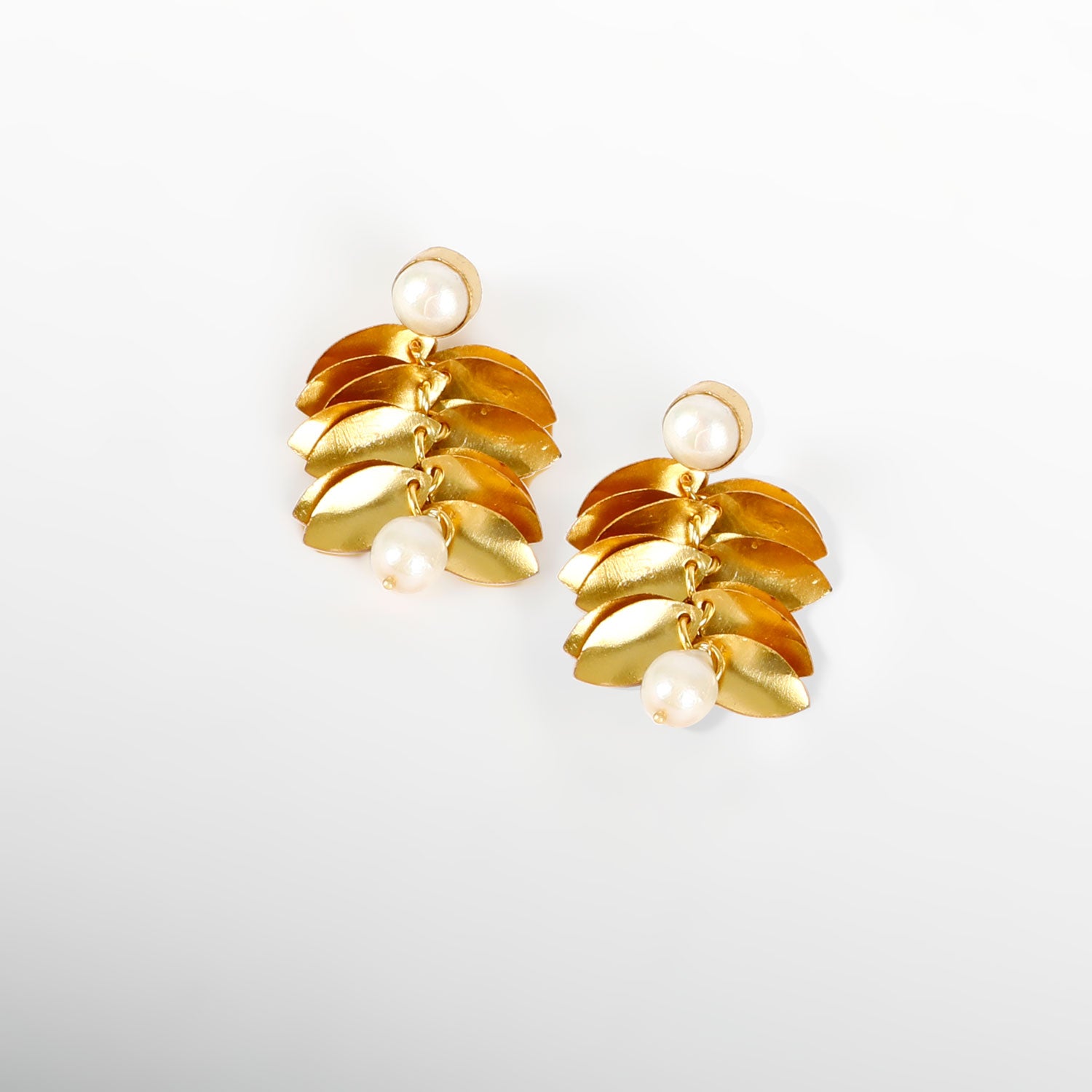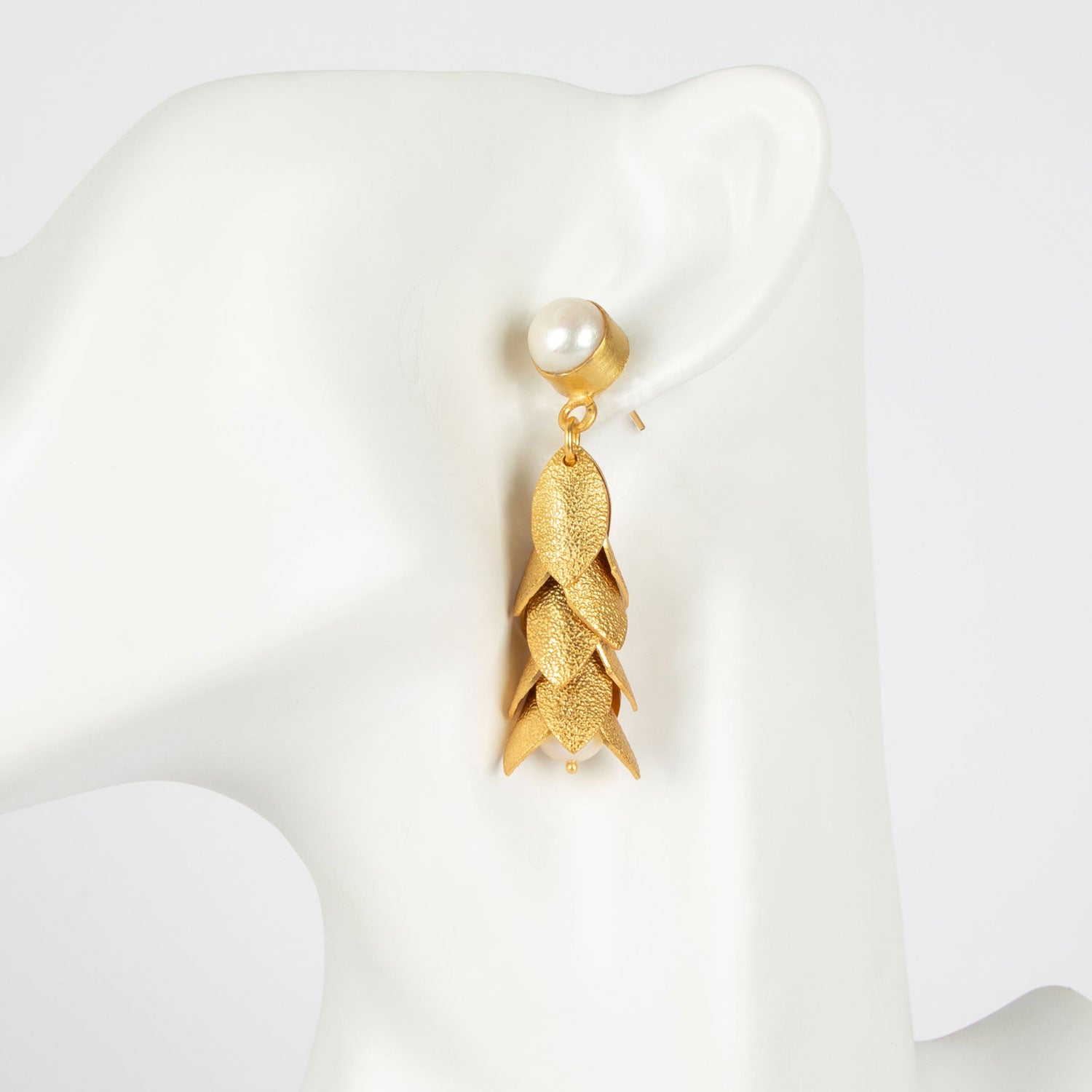 Designed to be striking and playful, these earrings appeal to customers seeking statement earrings, gold leaf earrings, faux pearl jewellery, and bold fashion accessories. They work equally well for events, celebrations, or as a standout addition to a contemporary jewellery collection.