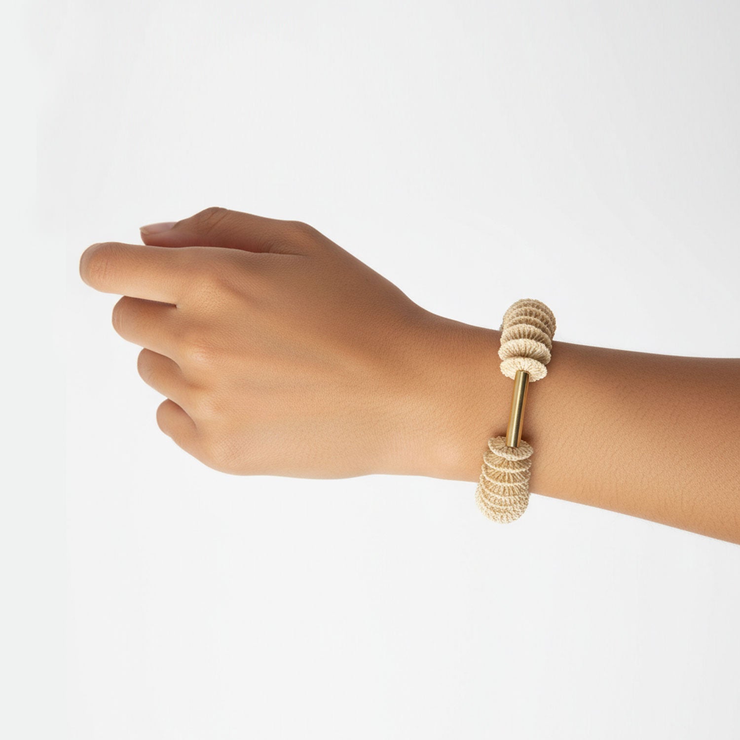 The natural fibres create a rich cream textured effect, punctuated beautifully with the 3cm gold bar. This unique bracelet will complete an effortless summer outfit or elevate a winter knit or suit.