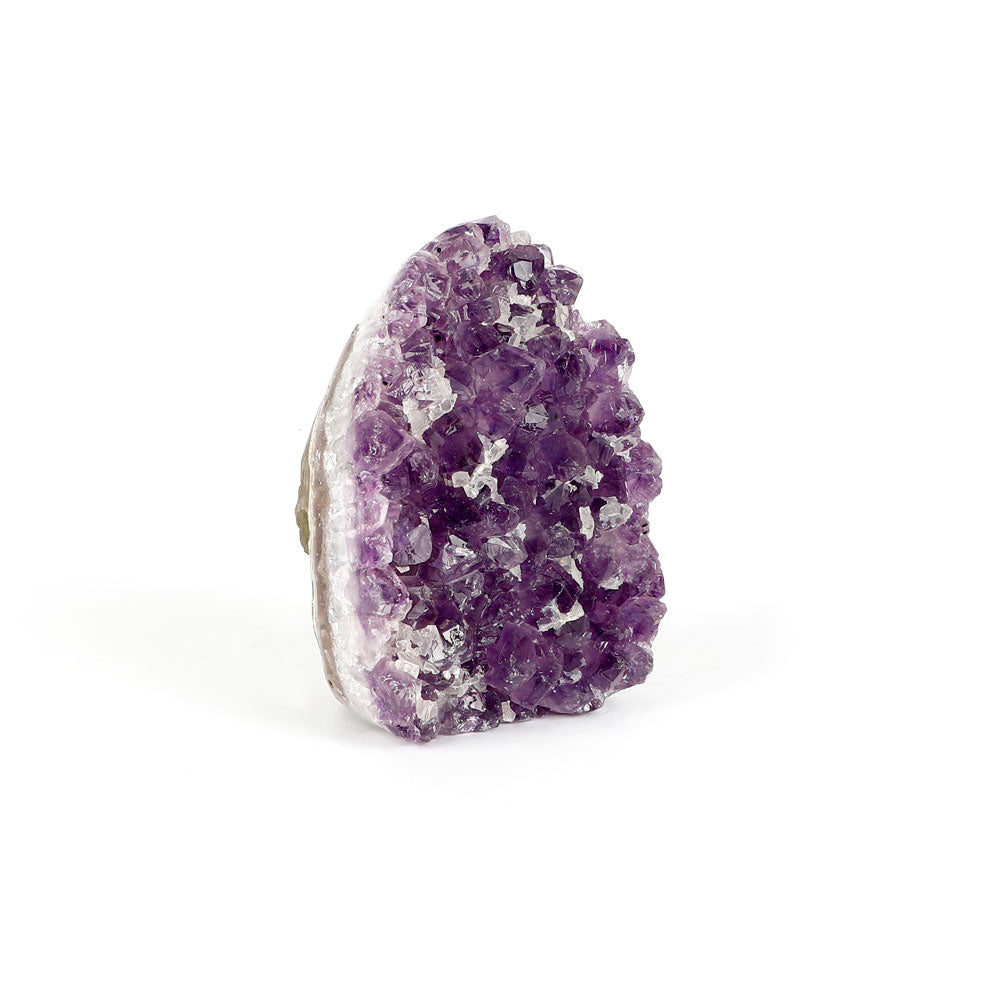 Resting on a neatly sawn base for stability, the freeform shape showcases the natural sparkle of amethyst crystals, making it a versatile piece for display in homes, offices, or personal mineral collections.